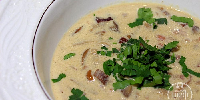 Шампиньоны, Чеснок, Сливки, Лук, Бекон, Петрушка, Белое вино, Мускатный орех