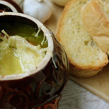 Сыр, Чеснок, Бульон, Лук, Белое вино, Багет
