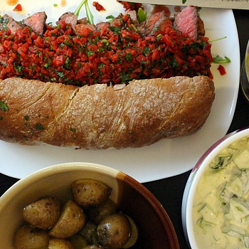 Розмарин, Говядина, Чиабатта, Свекла, Огурец, Картофель, Чеснок, Тимьян, Лимон, Сметана, Руккола, Петрушка, Сыр фета, Бальзамический уксус