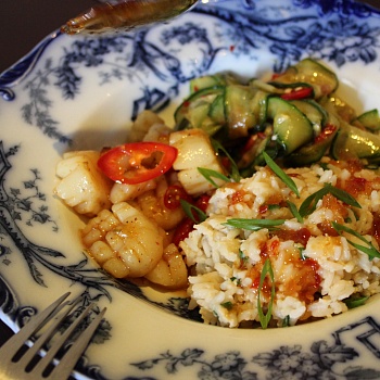 Яйца, Гребешки, Рис, Огурец, Чеснок, Лимон, Лайм, Мед, Чили, Петрушка, Имбирь, Зеленый лук, Кинза, Соевый соус, Кунжутное масло