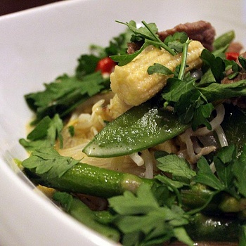 Рис, Говядина, Шампиньоны, Чеснок, Лимон, Лайм, Спаржа, Чили, Лук, Петрушка, Кукуруза, Имбирь, Кокосовое молоко, Гарам масала, Ростки фасоли, Побеги бамбука, Стручковая фасоль, Стеклянная вермишель