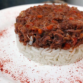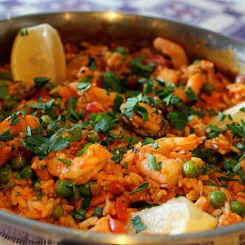 Рис, Кальмары, Креветки, Мидии, Лимон, Курица, Чоризо, Петрушка, Морковь, Перец, Томатная паста, Зеленый горошек