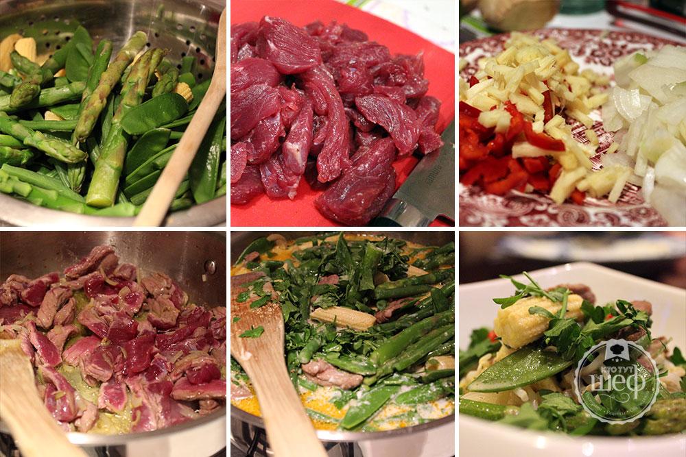 Поскольку процесс готовки очень быстрый, подготовим все ингридиенты заранее. Мелко нарезаем лук, чеснок, имбирь, чили. Говядину нарезаем мелкими полосками (если Вы не едите мяса, не добавляйте его. Можно добавить креветки или кальмары). Овощи предварительно отвариваем 3-4 минуты (если нет свежих овощей, используйте замороженную зеленую фасоль, мини-морковь, предварительно их разморозив. Мини-кукурузу можно купить консервированную. Или добавить шинкованные шампиньоны. Импровизируйте!)