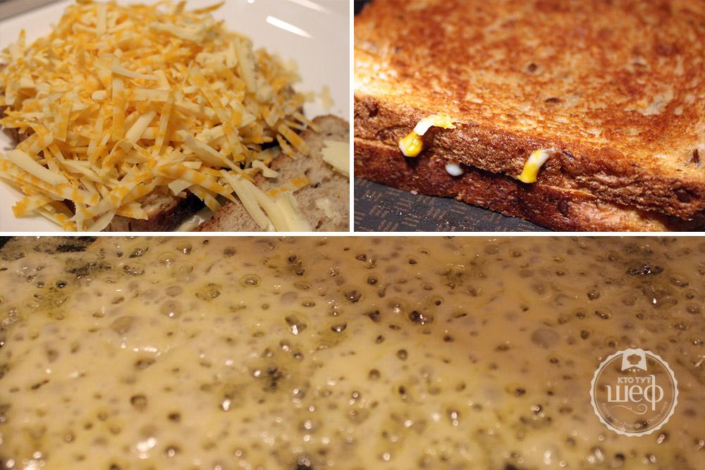 Когда сэндвич будет готов, переложите его на тарелку. На сковороду бросьте немного натертого сыра. Когда он начнет плавиться, верните сэндвич в сковороду. Так у нас получится хрустящая сырная корочка и мягкая, тягучая серединка))