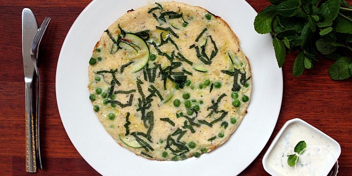 Готовый омлет подаем с рукколой, заправленной оливковым маслом.
