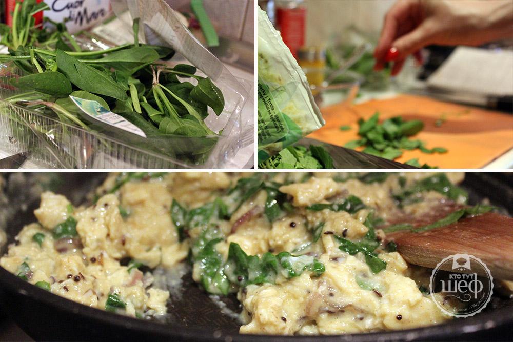 Яйца взбиваем вилкой вместе с куркумой и гарам-масала (я покупаю эту смесь специй в Вильнюсе, но ее можно купить на рынке), соль и перец по-вкусу. Вливаем яйца в сковороду. Добавляем сливочное масло и размешиваем вилкой, чтобы омлет «схватился». Измельчаем шпинат, добавляем его в яйца, выключаем огонь и перемешиваем.