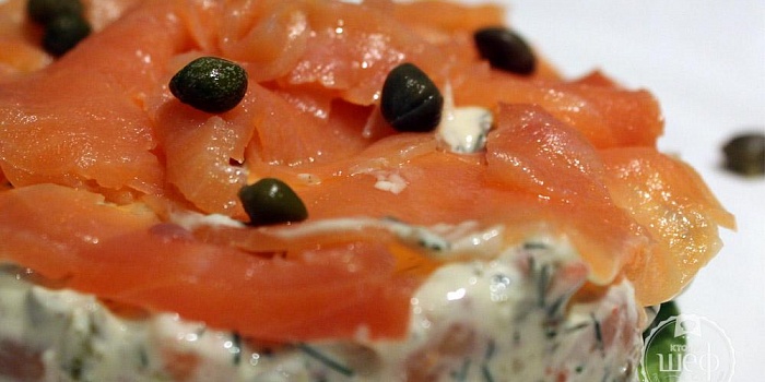 Сервируем: Рыбку нарезаем тонкими ломтиками. Картофельную подушку режем на сектора и раскладываем ее по порционным тарелкам. Сверху помещаем ломтики рыбки и поливаем соусом. Украшаем укропом.