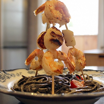 Морской гребешок, Паста с чернилами каракатицы, Морепродукты, Розмарин, Сливочно-кокосовый соус, Кальмары, Креветки
