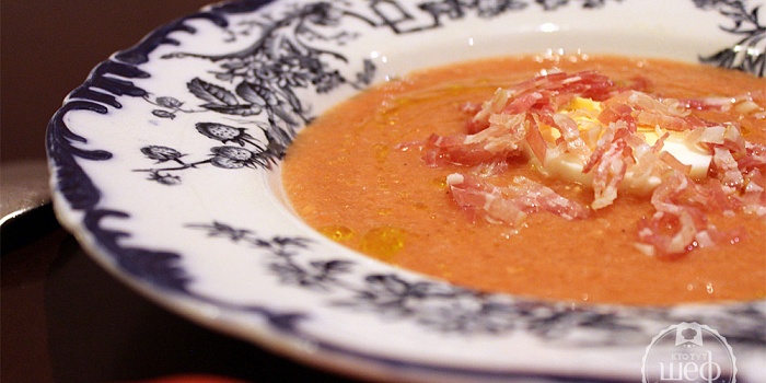 Суп-велюте с беконом и колбасками