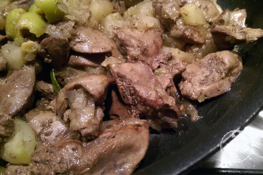 Мне нравятся блюда из печени — всевозможные паштеты, террины, тушеная печень или обжаренная. Мне нравится вкус куриной печени, ее мягкая, нежная текстура. Блюдо, которое мы сегодня приготовим, можно подать в качестве теплой закуски или в качестве основного блюда, все зависит от Ваших предпочтений. Мы добавим виноград и яблоки для сладости, зеленые оливки для кислинки, розмарин, лук и чеснок для бесподобного аромата. Ну и еще что-то:)) Приступим!